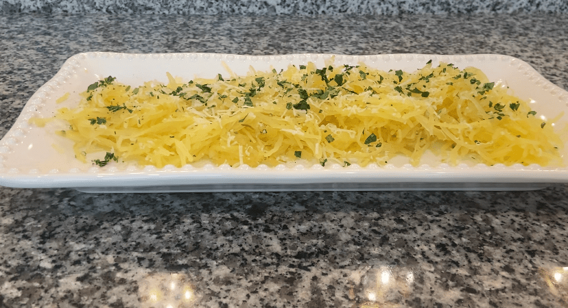 Directions: First preheat your oven to 400 degrees, next split your squash in to 2 even halves. Be careful as the skin is tough and this can be a difficult step. Next you need to use a spoon and scrape out all of the loose flesh and seeds. Mince 2 cloves of garlic and spread on the inside of the sqush. Drizzle about 1 or 2 tablespoons of olive oil on each half, and finally season with salt and pepper. Place both halves face down on a baking sheet and bake for 45 minutes or until tender. Remove from the oven and let rest for about 5 minutes, then using a fork, gently scrape the inner flesh. Serve this in the squash itself, or on a plate. Check for seasoning, add cheese and parsley….and enjoy!