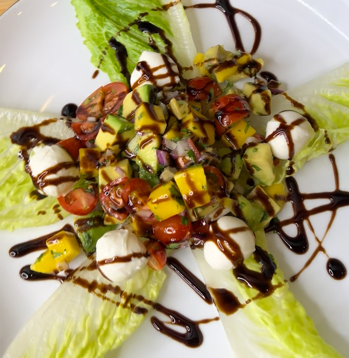 For plating, add some romaine leaves to your plate, add the salad on top, and fionally garnish with balsamic glaze